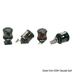 Omologati anche per Marina Mercantile. Realizzati in policarbonato nero e acciaio inox. Completi di speciale lampadina a filo verticale.