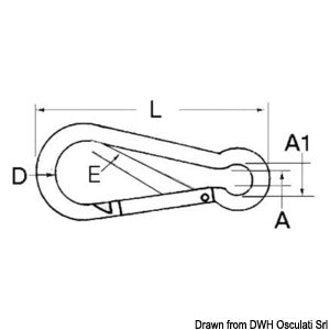 Moschettone inox AISI 316 lucidati a specchio, con molla. Anello a redancia sull'occhio
